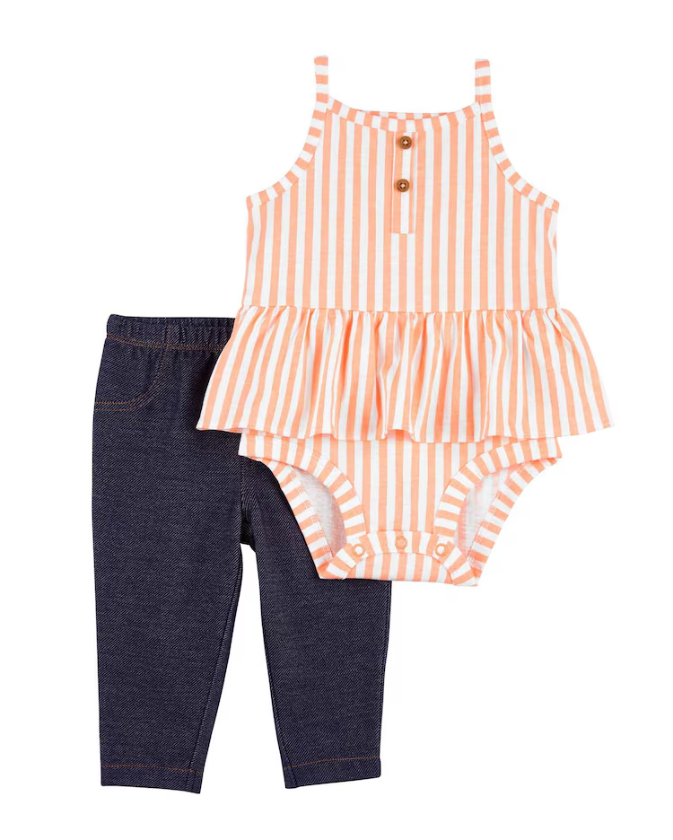 O Conjunto longo bebê 2 peças de elástico listrado multicor | Carter’s é delicado e deixa sua baby ainda mais fofinha. Feito de algodão, o conjunto conta com uma calça com cós de elástico e um body listrado com babadinhos. Ideal para os papais que buscam praticidade e estilo para a sua bebê.