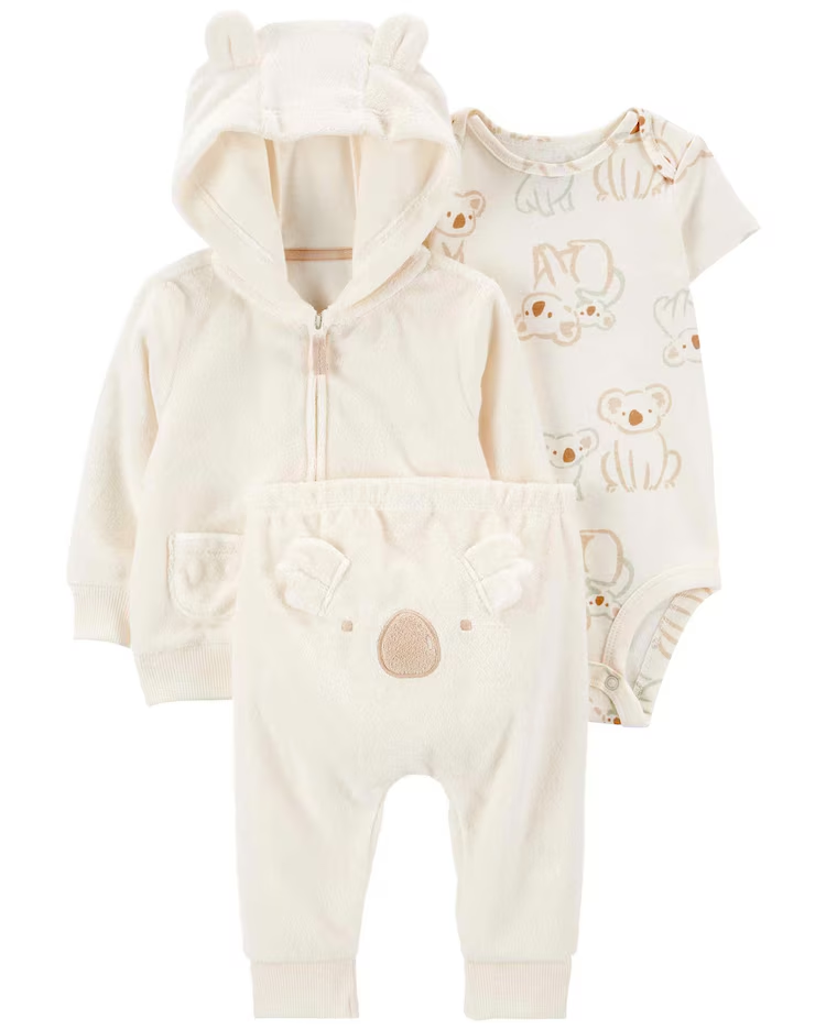 Perfeita para aquecer os pequenos, o Conjunto longo bebê 3 peças capuz coala bege | Carter’s traz o conforto e o aconchego tão necessários. Feito de algodão, o conjunto conta com um casaco com capuz, é super estiloso por conta de sua estampa listrado, acompanhado por uma calça com cós de elástico e fecha com um body com estampa de baleia. Aproveite!