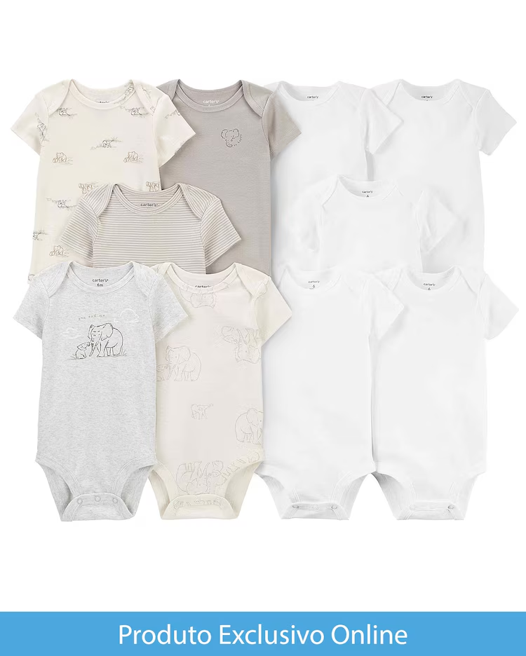 O Enxoval bebê 10 peças lisos e elefantes multicor | Carter’s será a pedida certa para aliar conforto e economia para o seu bebê. Produzido em algodão, o enxoval vem com oito bodies de manga curta, ombros traspassados e variam entre estampas diversas, mas também em versões lisas. Aproveite!