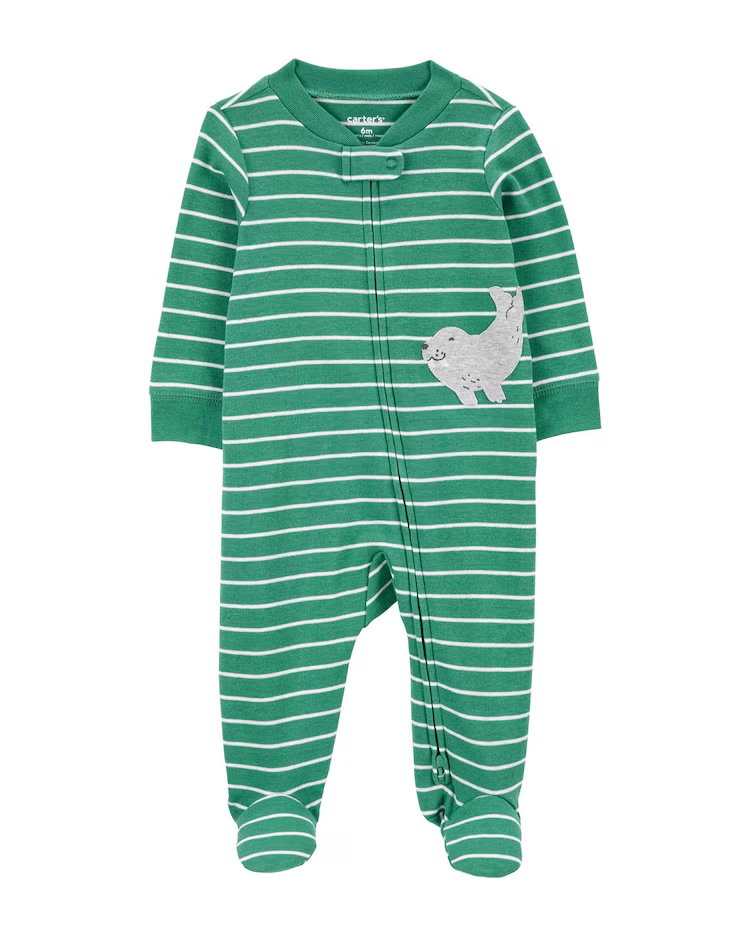 Alie fofura e conforto para sua baby com o Macacão bebê foca listrada verde | Carter’s. Feito de algodão, o macacão é perfeito para ser usado em dias frios ou com clima amenos, possui fechamento por zíper inverso, martingale para proteger seus dedinhos, com pezinho e super prático. Ela ficará ainda mais linda com essa estampa listrada e patch de foca aplicado. Aposte!