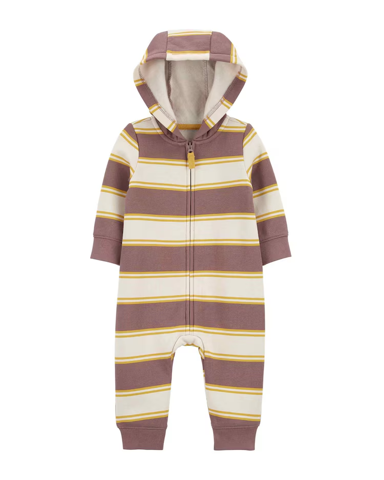 O Macacão bebê listrado com capuz bege | Carter’s é confeccionado em material macio e aconchegante, com zíper frontal, abotoamento entrepernas, manga longa, capuz e estampa listrada. É ideal para todos os momentos. O modelo esbanja fofura e delicadeza, invista, seu baby merece.