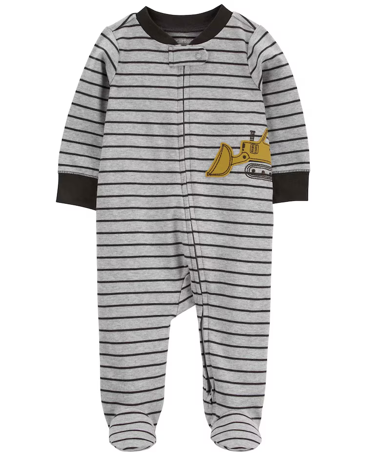 O Macacão bebê trator e listras cinza | Carter’s é confeccionado em material macio e aconchegante, com zíper frontal, mangas longas, gola redonda e estampa listrada. É ideal para todos os momentos! O modelo esbanja fofura e delicadeza, invista, seu baby merece.